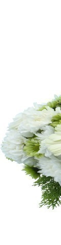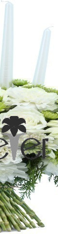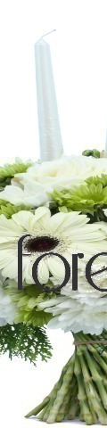 5 White Carnations, 3 White Roses, 2 White Gerbera, White Chrysanthemums, Green Chrysanthemums, 3 White Candles