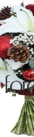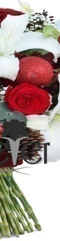 Bursting with fragrant blooms and festive delights, the Santa's Sleigh Christmas Flower Bouquet will bring a touch of joy into any home this Christmas. A striking display for friends, loved ones and business associates, this exquisite flower arrangement includes 4 white lilies, 5 red roses, gypsophila, 4 pine cones, and 4 ruby red baubles inspired by the most wonderful time of the year. A great Christmas bouquet for December birthdays and winter weddings.