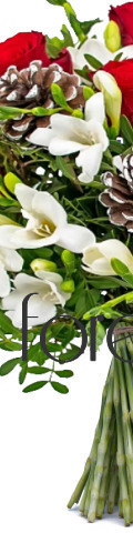 6 Red Roses, White Freesia, Pinecones